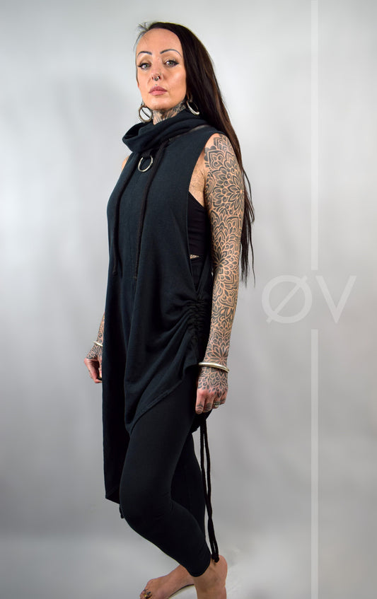 Asymmetrical Poncho Cape Dress Cowl // Black Hemp Cotton Sweatshirt Fleece Vegan Leather // Minimalist Goth Beach Hippy // Sustainable
