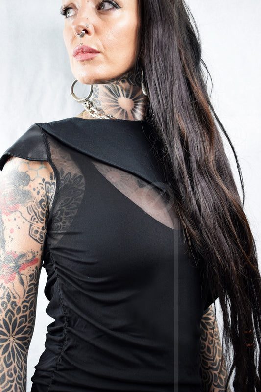 Long Mesh Top // Vegan Leather Cap Sleeves // Hemp top // Ruched Gathered // Goth Minimalist Futuristic //
