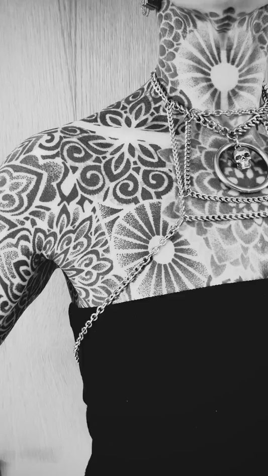 Delicate Chain Harness // Bold Square Design // Metal O Ring // Silver Skull // Goth Alternative Avant Garde.